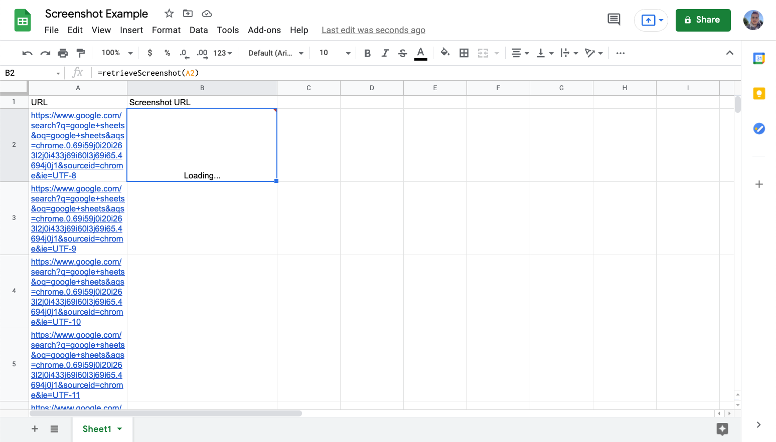 For the URL you can pass anything. It can be the content of another cell or a URL you want to pass verbatim into the function. When you hit enter the sheet will retrieve the screenshot.